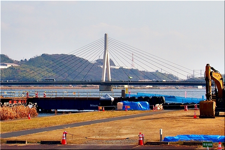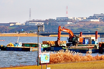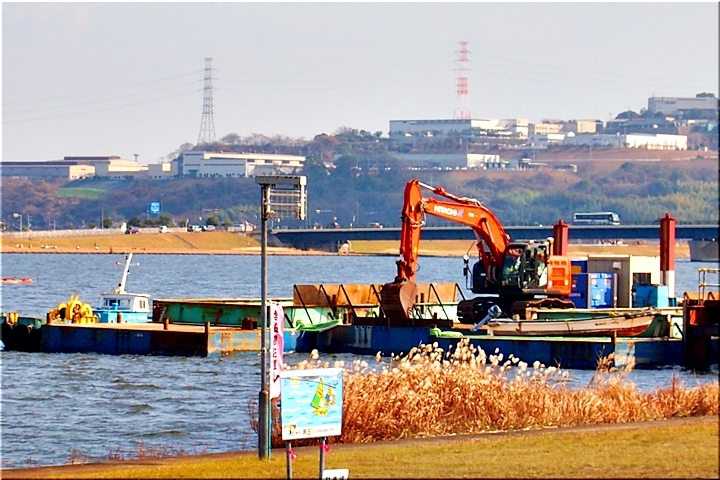 芦田川大橋の少し上流辺りまで戻って来まして、河道掘削工事≠フ現場を覗きますと、人影はありません。仕事始めは、いつなのでしょうネ。