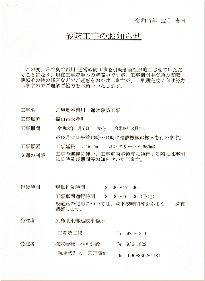 続いて砂防工事≠フ案内ですか…六方学園付近の砂防工事は、予定通り順調な進捗なんでしょうけど、工事進捗に伴います「建設機械の搬入」で注意喚起のお知らせのようです。工期の変更等の案内では無いようですネ(^-^)