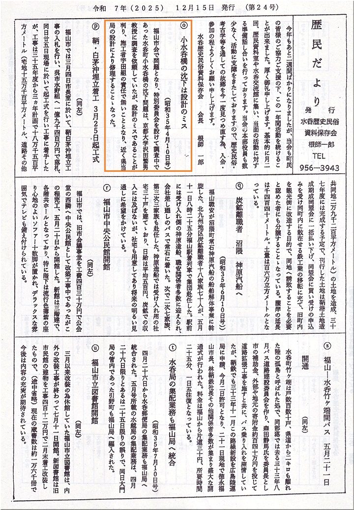 福山市会で問題となり、特別委員会を設けて調査中であった水呑町小水呑橋の沈下問題は、京都大学沢田繁男教授に調査を依頼していたが、設計のミスであることが判り、施工者宇田組の責任で無いこととなり、近く、県当局の設計により修理することとなった。