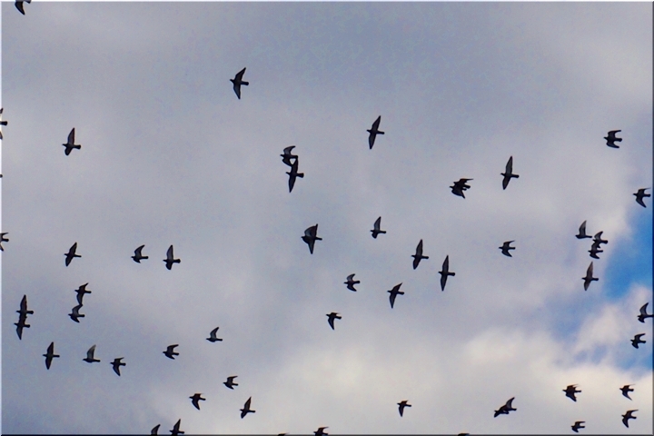 三グループが二つ、一つと、合体し、また三つに戻ったりと繰り返しておりますけど、この行動を、別段、リーダーがいて、リーダーの合図の元に右旋回、左旋回、グループを合体…と繰り返していますようには、とても見えません。リーダーの合図がなくても一斉に同じような行動を取っていますけど、これは実に不思議です。上空を旋回しながら、何で、ハトの皆さんは、一斉に同じ行動が瞬時に取れますのでしょう?