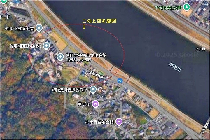 …と言いますのも、小水呑橋〜水呑大橋間の山側に創価学会sanの建物がありますけど、この建物の近隣南側にハトを飼っておられますお宅がありまして、50〜100羽のハトsan達が、大概午前中に創価学会建物の上空から河川敷上空に向けて、円を描くように2〜3のグループに分かれ、毎日、旋回しております。