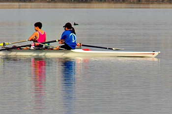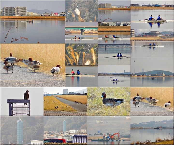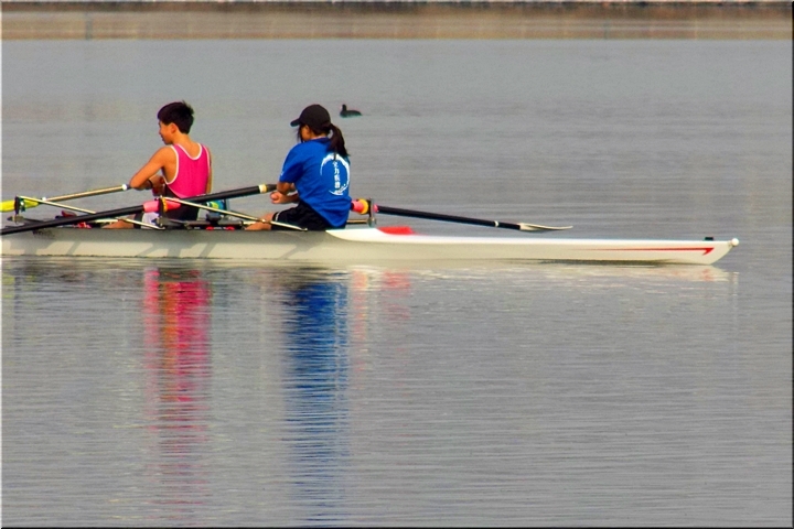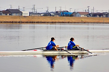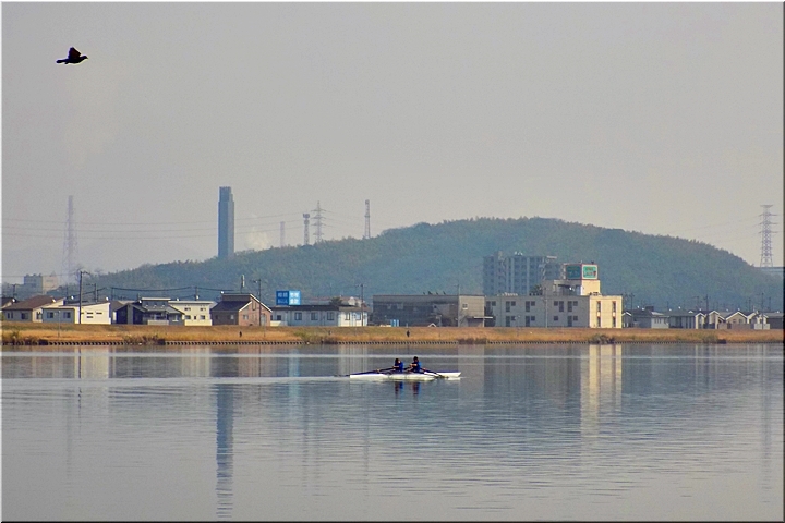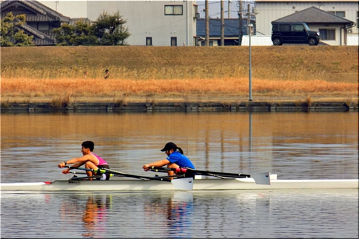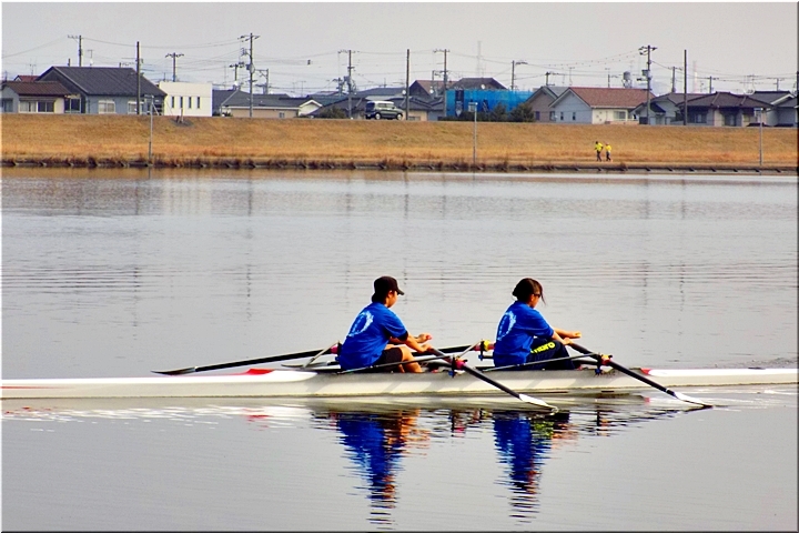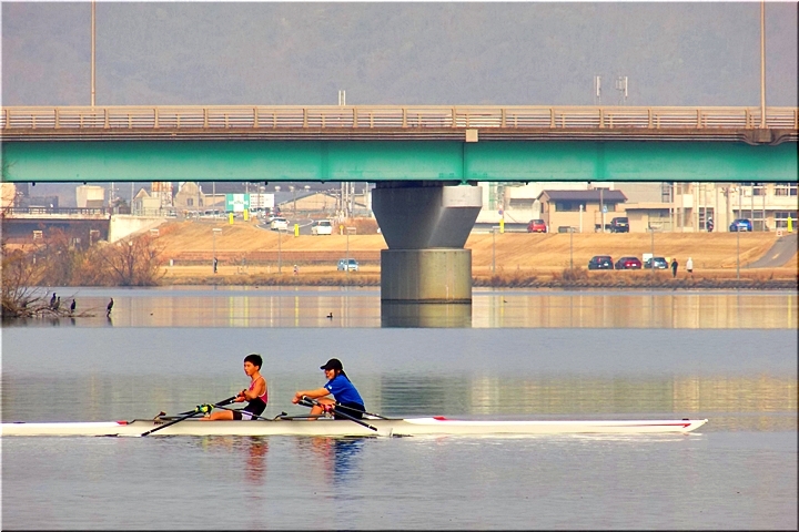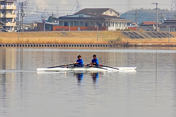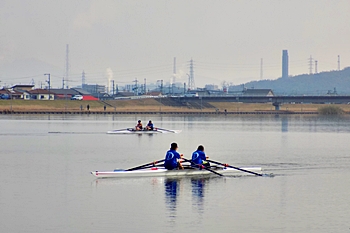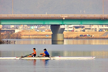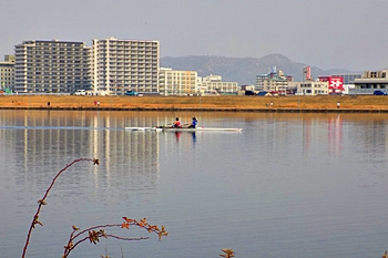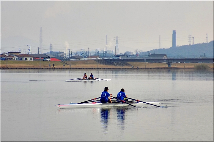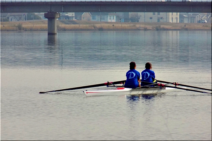 2艇とも、お二人とも、オールを右手と左手に1本ずつ合わせて2本持って漕いでおられますから、ダブルのスカル≠ナすネ。この芦田川漕艇場≠ナはシングルスカル≠フ練習光景は、よく見掛けますけど、ダブルスカル≠ヘ珍しいかも…
