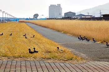 小水呑橋〜芦田川大橋間の河川敷の、GONsanの進行方向にはカモsan一家がノンビリと過ごしておりました。