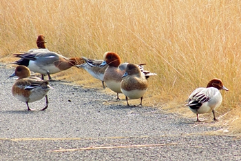 そして、いよいよ接近しますと、ピィー≠ニ合図の親ガモで、子ガモの皆さんは一斉に護岸方向へ…親ガモの合図に即座に従います可愛いぃ子ガモの皆さんで、実に微笑ましい光景でありました。