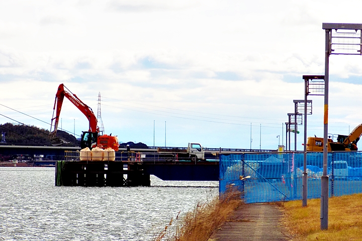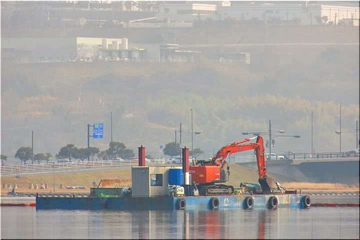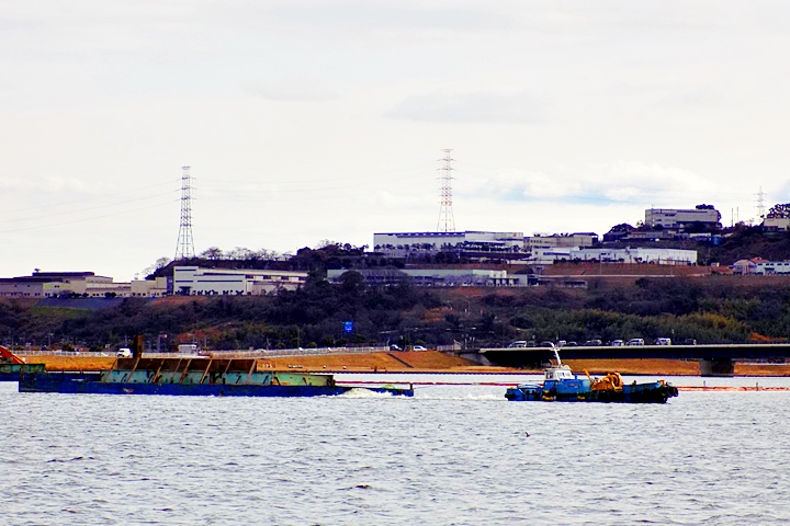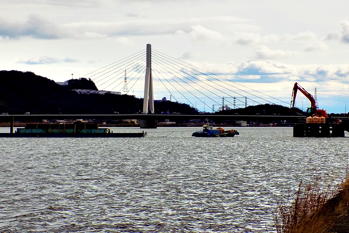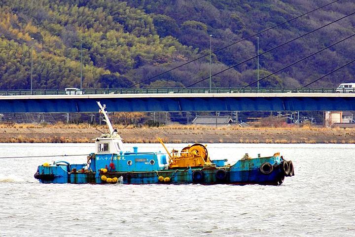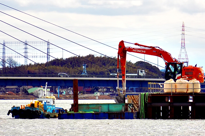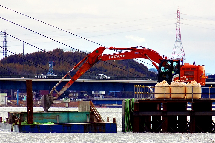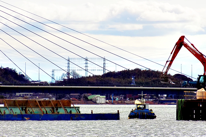 芦田川大橋から少しばかり上流の左岸側の河道の土砂を、クレーンで運搬船に掬い上げ、これをタグボートで右岸側に曳航し、運搬船の土砂をクレーンで陸揚げしダンプに積載です。