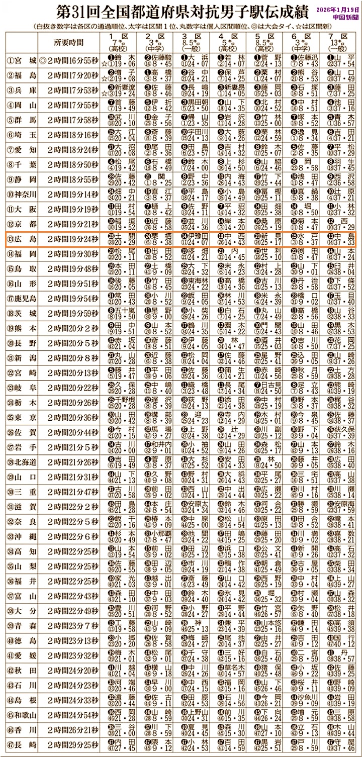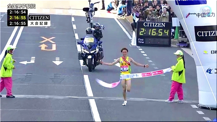 6区では坂中学校の水戸拓真選手が20位でたすきを受けて区間3位の走りで5人を抜き、最終7区でも中国電力の中島大就選手が2つ順位を上げ、2時間19分24秒の13位でフィニッシュしました。