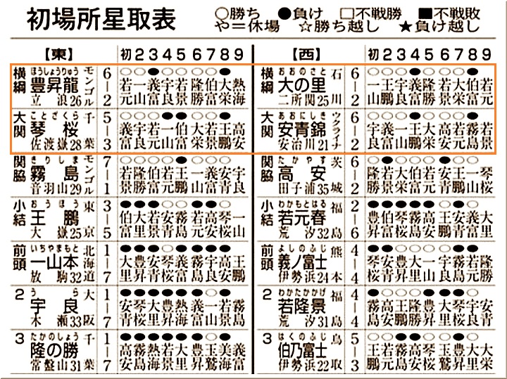 6年ぶりの天覧相撲は2横綱、2大関がすべて敗れる大波乱となった。横綱は豊昇龍が大栄翔にはたき込まれ、大の里も伯乃富士に押し出され、ともに金星を配給し、2敗に後退した。新大関の安青錦は関脇霧島に寄り倒され2敗、琴桜は王鵬に押し出され3敗となった。天覧相撲で横綱、大関総崩れは蔵前国技館で初めて実施された1955年夏場所以降初となった。1敗は霧島、阿炎の2人。2敗で関脇高安ら8人が続く。
