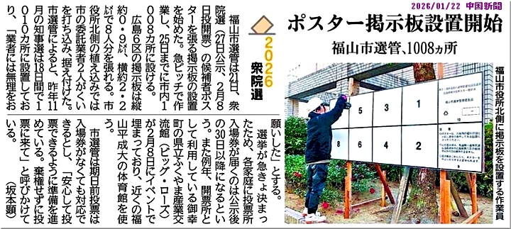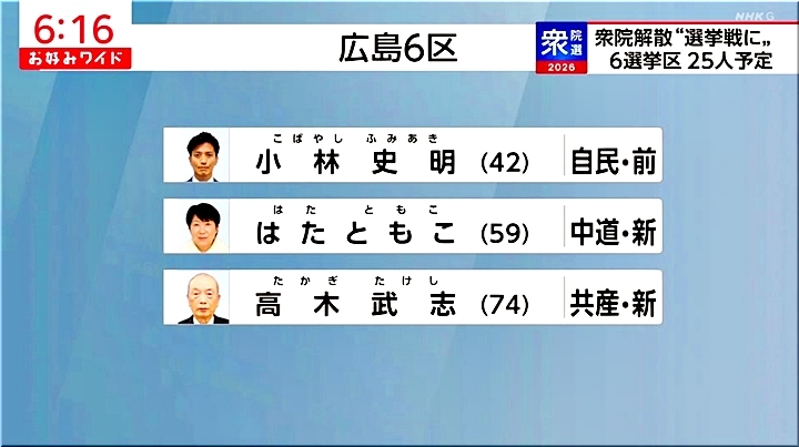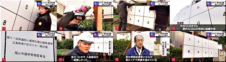 夕方のTVニュースでは、広島県6選挙区に25人が立候補予定で、福山選挙区(広島6区)には、