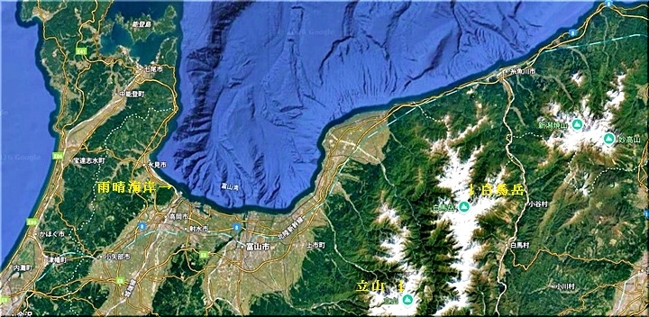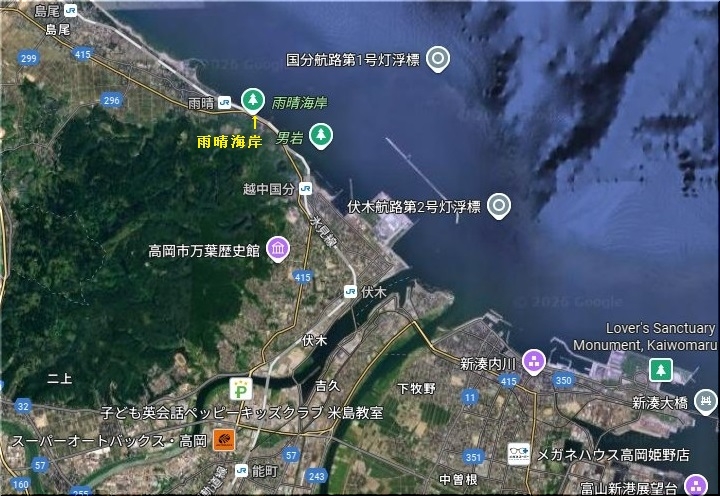 雨晴海岸付近は男岩や女岩をはじめとする小さな島や岩礁が多く、立山連峰を背景に望む景勝地である。