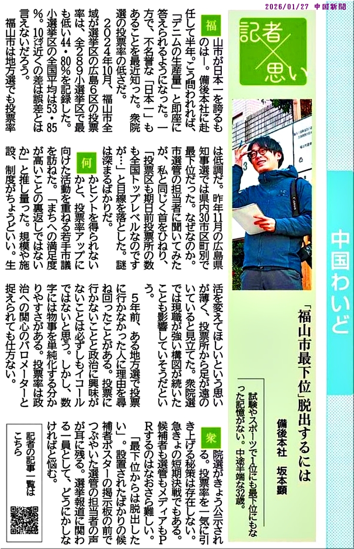第51回衆院選が1月27日に公示され、2月8日の投開票に向け、12日間の選挙戦に突入しておりますけど、公示日の中国新聞sanの朝刊に、こんな記事掲載が…