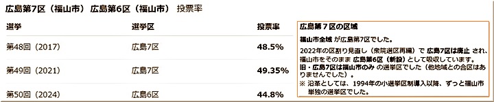 ここ近年、色んな選挙で、福山市の投票率の低さが定着しておりまして、『投票率県下ワースト1』と言われましても、別段、驚きもありません福山市民の皆様だろうと思いますけど、前回、2024年10月に実施されました第50回衆院選≠フ広島6区≠フ投票率は、県内・国内いずれでも投票率ワースト1≠ナしたとは知りませんでしたネ(^-^;