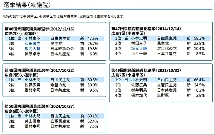 5回の選挙とも、小林は次点の候補者にダブルスコアかそれに近い差を付け、49回(7区としての最後の選挙)ではほぼトリプルスコアの差まで付けており、保守王国の復活が顕著になっている。