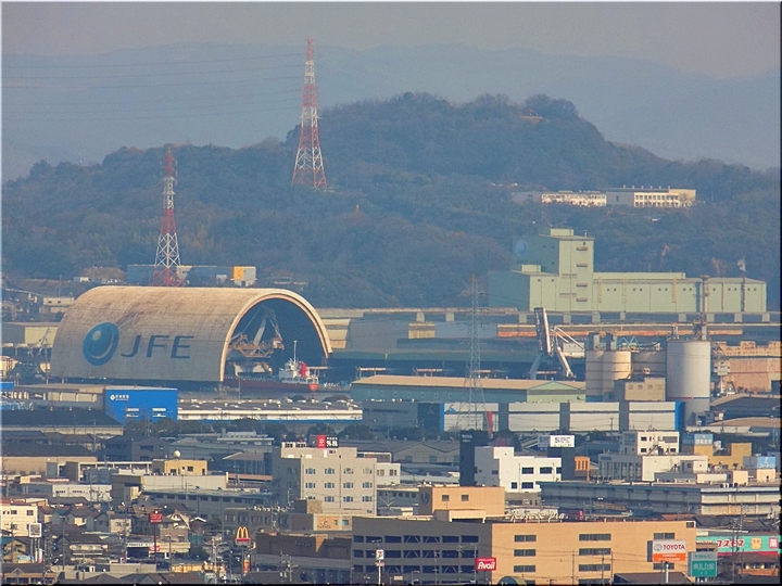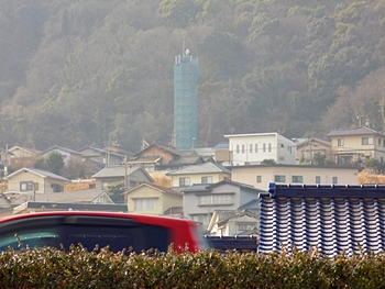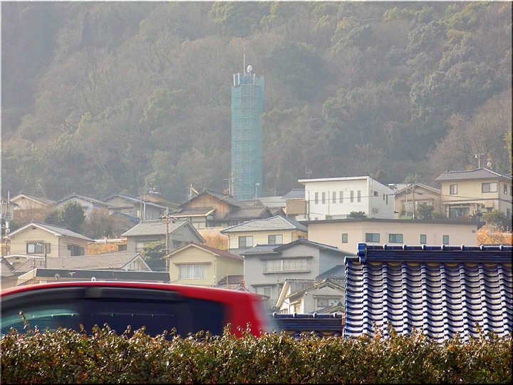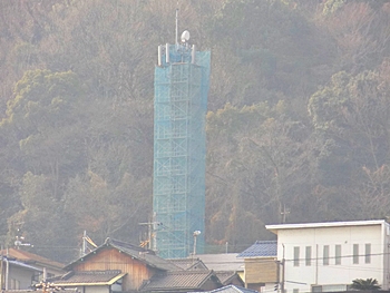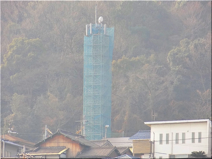 スグ近くまで行ってみましたら、中国電力sanの管理します塔のようで、以前からここに存在し、ペンキの塗り替えか何かの補修工事でシートに覆われていますようでありました。