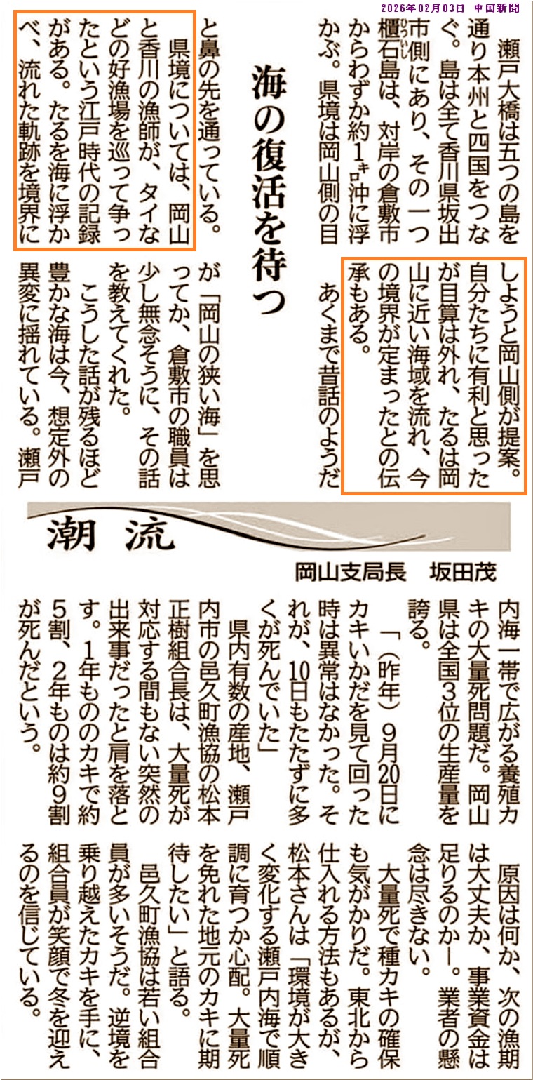 …県境については、岡山と香川の漁師が、タイなどの好漁場を巡って争ったという江戸時代の記録がある。たるを海に浮かべ、流れた軌跡を境界にしようと岡山側が提案。自分たちに有利と思ったが目算は外れ、たるは岡山に近い海域を流れ、今の境界が定まったとの伝承もある。…