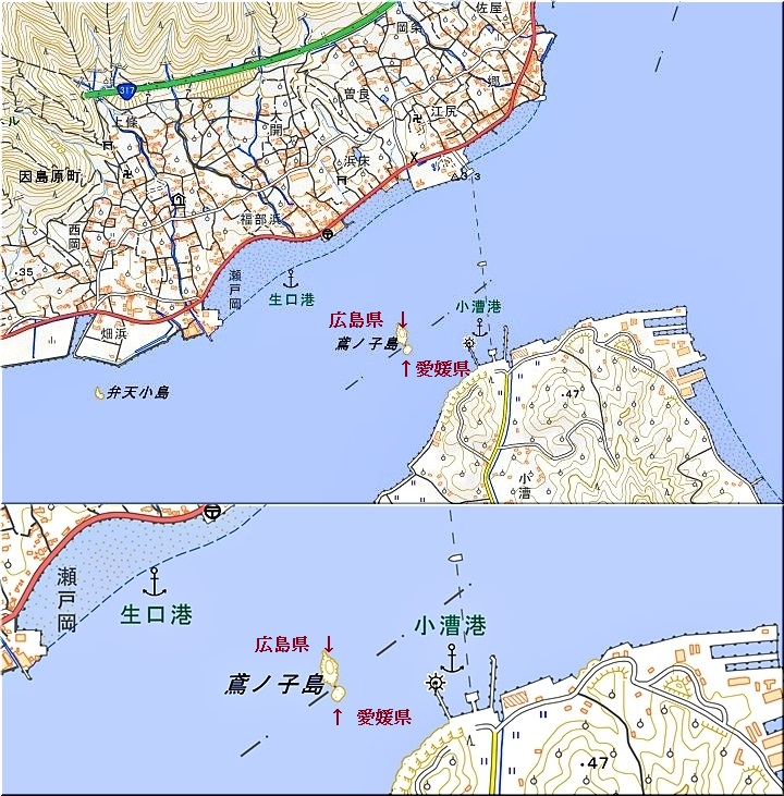 鳶小島(とびこじま) 広島県尾道市 愛媛県上島町 2島で構成。2島の間に県境が引かれている。鳶ノ小島・鳶ノ子島とも。