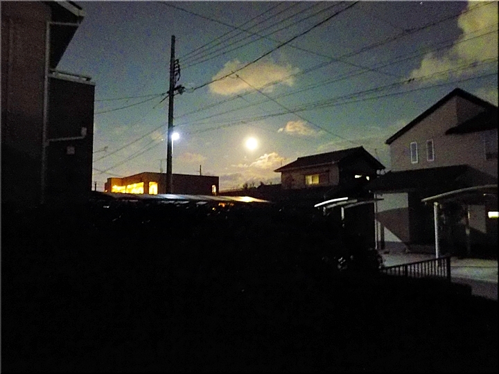 そぅでした、この日は満月≠ナありました。で、急いでスマホを取り出し一枚パチリ。肉眼では大変キレイでありましたけど、GONsanの低性能機種では、こんなもんかも分かりません。