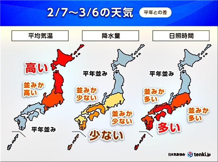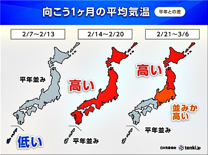 2/21〜3/06:西日本--平年並み、東日本--並みか高い、北日本--高い