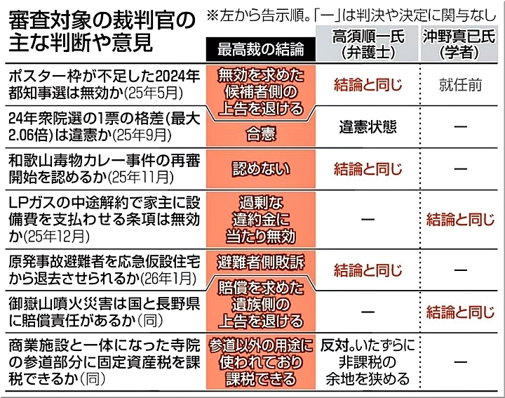 今回は、前回からわずか約1年3か月後の審査で、対象となる高須順一氏(66)と、沖野真已(まさみ)氏(62)の2人はいずれも任命1年未満。関与した重要裁判が多いとはいえず、判断材料の乏しさは否めない。