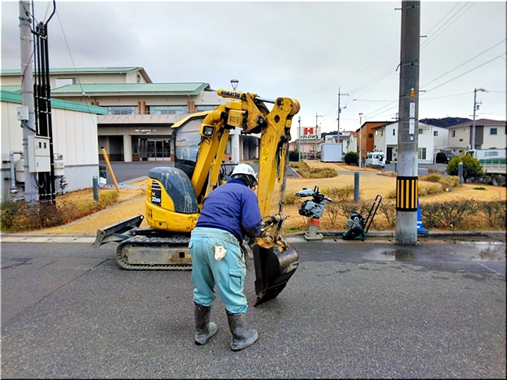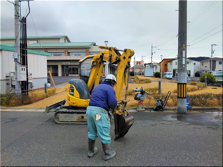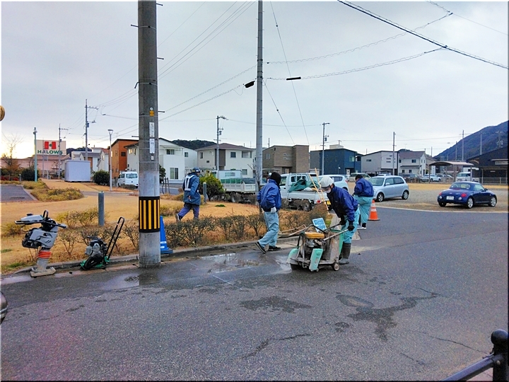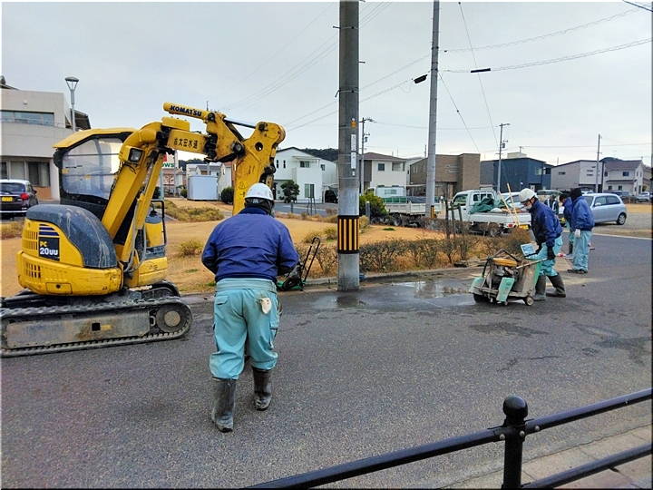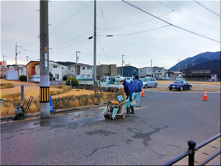 まず、工事前に、必要最低限の市道のアスファルト部分を切り開きですけど、現在は、こんな機械でいとも簡単に(^_^)v