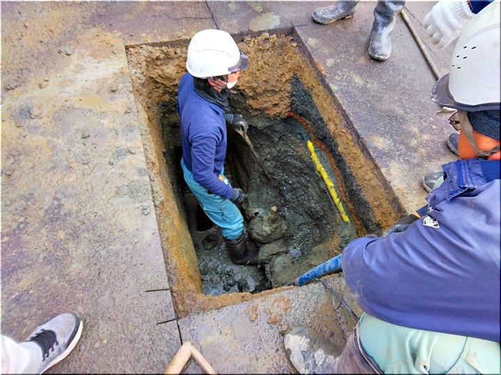 人力・ミニユンボ≠ナ1m程度掘削して行きますと、水道管が現れましたネ。黄色いのは、都市ガスの配管?…それとも、中電・NTTsan関連の配管なのかも…