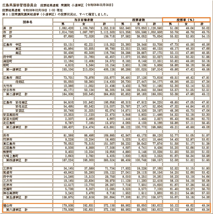 で、気になりますのが広島6区≠フ投票率。今回選挙の広島6区投票率は「49.34%」でありました。と、言う事は、