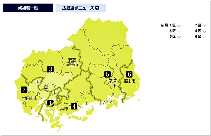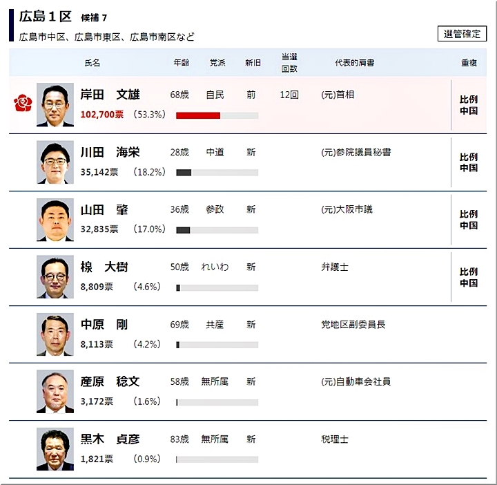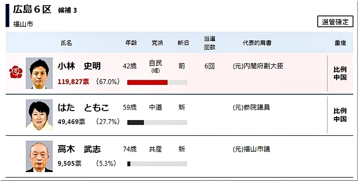 広島1区:48.58%、広島2区:49.12%、広島3区:48.06%、広島4区:51.93%、広島5区:54.36%、広島6区(福山市全域):49.34%ですから、今回選挙に限りましては、悪名高きワースト1≠ゥらは逃れられましたようですネ(^_^)v そして、気になりますのが当選者の得票数であります。