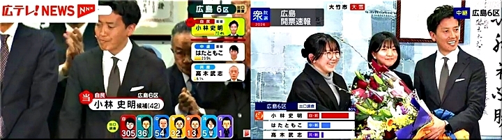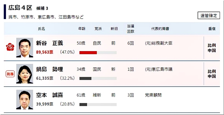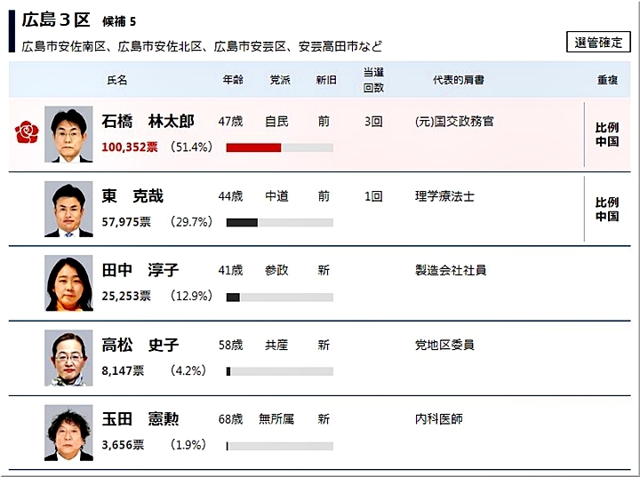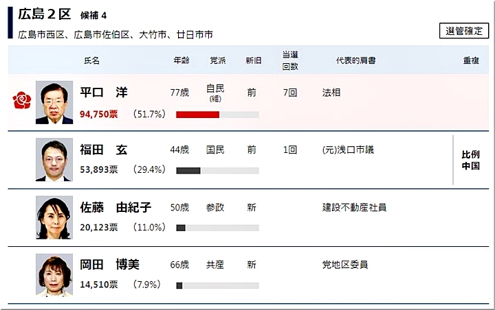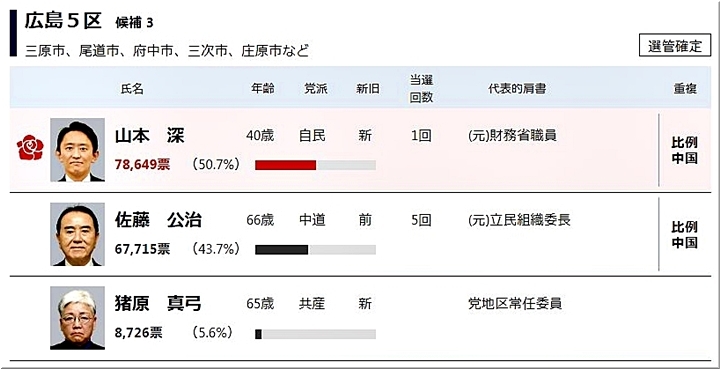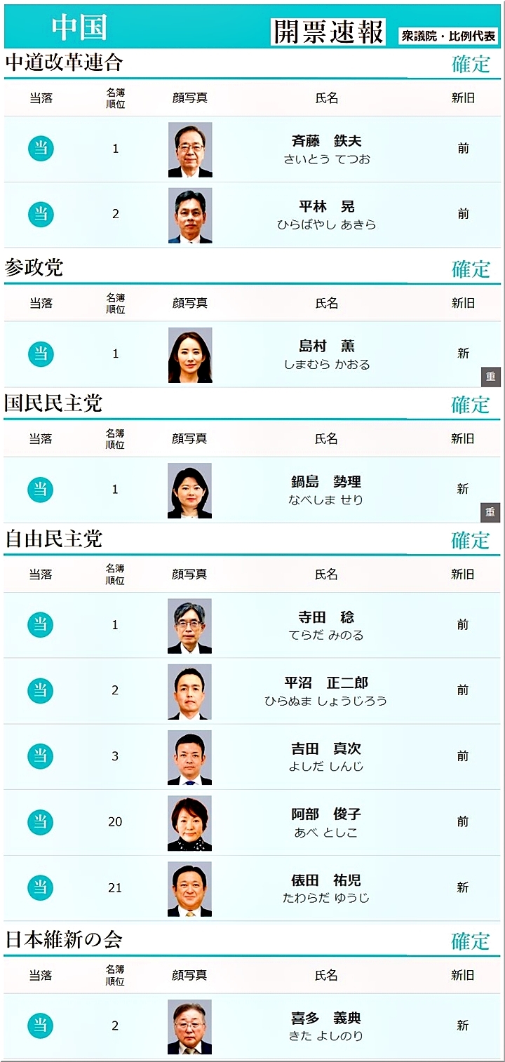公選法の規定では、比例名簿登載の候補者が全て当選した場合は、次に上位を占める政党に議席が割り振られる。その結果、自民の6議席目は維新に移り、比例中国の政党別の獲得議席は、自民5▽中道改革連合2▽維新1▽国民民主党1▽参政党1―となった。