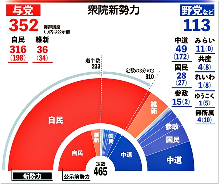 開票結果は、自民が316°c席で維新が36°c席。与党合計352議席となりましたけど、自民党単独で定数の2/3を獲得と圧勝でありました。
