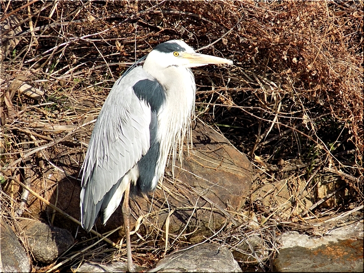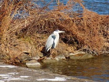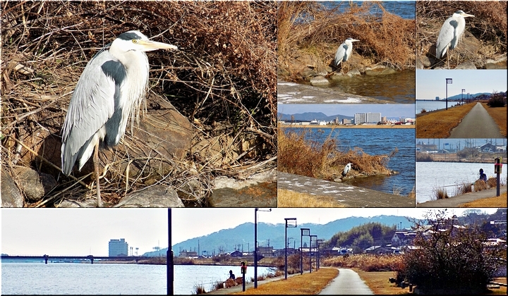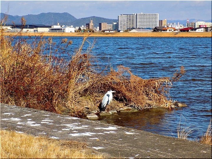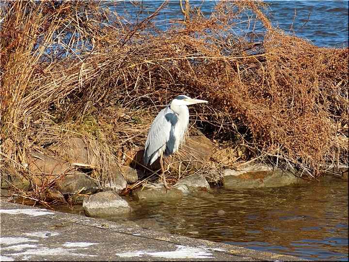 このアオサギ君は、この辺りの護岸でよく見掛けます。この場所は、カモsanペアの定位置でもあるのですけど、この日はアオサギ君が(^-^)