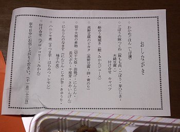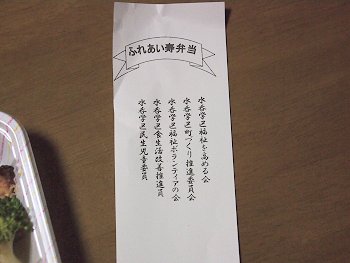 この日は、一人暮らしのご高齢の方々に「ふれあい寿弁当」をお配りし、戴いて貰いますとか…「水呑学区福祉を高める会」ほか4団体の主催で実施しておられますようで、昼過ぎまで嫁さんもお弁当作りに出かけていましたようです(^.-)☆