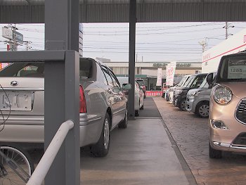 TAXsanは、小川を挟んで国道2号線側が展示場で、手前が工場。そして喫煙コーナーは展示場の一角に存在です。