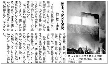 今朝、中国新聞朝刊に眼を通しておりますと、昨夜の王子町の民家火災が写真入り記事で掲載がありました。