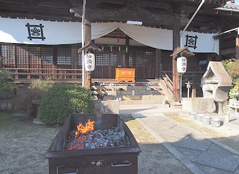 本堂前の境内には、除夜の鐘突きの参拝者の方々への暖ですけど、まだ残り火が熱く燃えておりました。