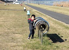 孫二人は、早々に凧揚げは諦め「帰ろう…」と言うのかと思いましたら、河川敷に存在します、あまり砂がありません小さな砂場で砂遊び。