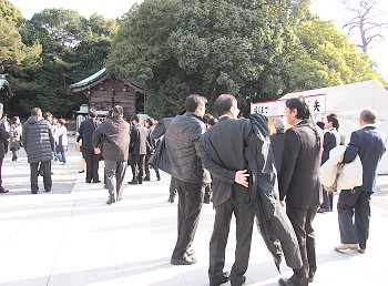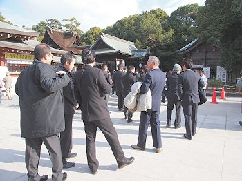 新年互礼会開催の会場に集合し、各部署の代表者の方々でまずは福山八幡宮での安全祈願。