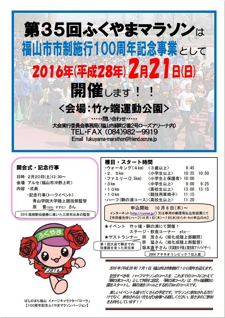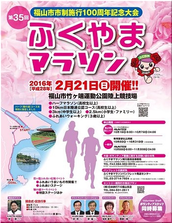 2/21(日)に開催の「第35回ふくやまマラソン」も迫ってきましたけど、今回は「福山市市制施行100周年記念大会」として、コースを変更しましての実施。