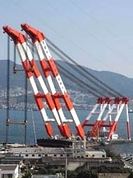 世界最大級のクレーン船「武蔵」が21日、呉市の川原石西埠頭(ふとう)に接岸し、宝町の海上自衛隊呉史料館(仮称)に展示する潜水艦の陸揚げ準備に入った。武蔵は深田サルベージ建設(大阪市)の所有。自力航行はできず、台船に引かれて移動する。2本のクレーンを備え、最大3,700トンをつり上げる能力を持つ。陸揚げする潜水艦は、24日午後2時20分からつり上げ作業をする。