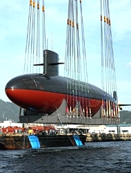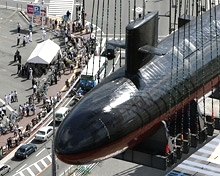 呉市宝町の海上自衛隊呉史料館(仮称)に展示する潜水艦「あきしお」(2,250トン)の陸揚げが、24日から26日未明にかけてある。船体は昭和町の工場で化粧直し中。初日は川原石西埠頭(ふと)まで海上移送し、クレーン船でつり上げる。25日は大和ミュージアム西の埠頭で午前10時20分から陸揚げ、76メートルの船体を17台の台車に載せる。史料館まで200メートルの移動は午後11時半から1時間半かけてする。