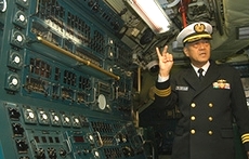 【写真説明D】「あきしお」内のコントロールパネルを説明する中橋室長