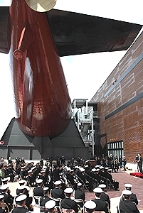 【写真説明E】てつのくじら館の誕生を祝い、潜水艦の下で行われた記念式典(撮影・新山創)