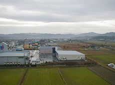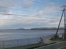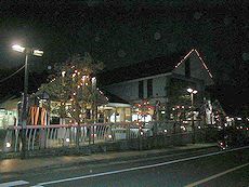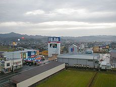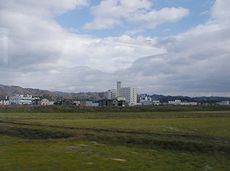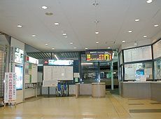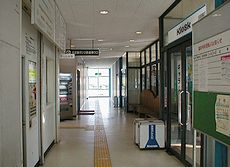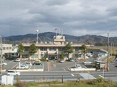 京都府峰山総合庁舎です (中)峰山駅待合室の廊下です (右)車窓から宿泊しましたホテルを