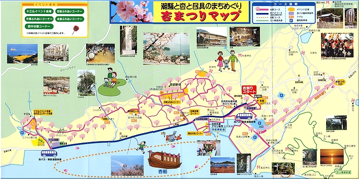 ポイントには各町内会の工夫したイベントや楽しい売店、杏の丘のコンサート、伝統芸能等、ゆっくりお楽しみ下さい。特に杏船に乗って田尻沖から花咲く丘を仰見するコースは素晴らしく、この外、特設の杏バスご利用も便利です。何とぞみなさま、杏祭りの一日、楽しい素晴らしい思い出を作ってお帰り下さい。