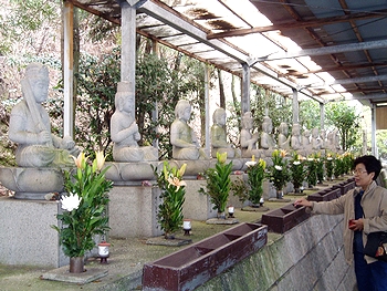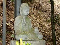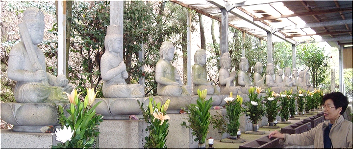 ■十三仏信仰(じゅうさんぶつしんこう)日本の庶民の尊崇を集め、かつ最も親しまれている13の仏の信仰。宗派とは無関係であるが、真言宗では檀信徒の日用経典にも十三仏の真言が取り入れられ最も盛んである。十三仏の信仰は、中国や朝鮮半島にはなく、日本独自の庶民信仰で、したがって、成立の根拠となる経典もなく、長い年月のうちに自然に成立、普及したものである。最初大和地方からおこり日本各地にひろがったようである。初めは(鎌倉期と推定される)9仏とか10仏が1枚の石に刻まれていたのが、室町期になって現在の十三仏の仏像が確定したものと思われる。現存する最古の石碑は1479年(文明11)の銘を有する信貴山のもので、1539年(天文8)の銘を有する天理の浄土院、1555年(天文24)の銘を有する同じくキョ原大念寺のものが有名である。1石13仏の場合、3体ずつ4段に並び、最上段に虚空蔵菩薩を置いているものが多く、画像の場合は、この形式に加えて十三仏来迎の形式をとっているものもある。十三仏石碑は、寺の門前(のちには寺内)や村の入口などに立て、先祖の冥福と仏の加護による招福除厄を祈ったのが始まりであるようである。十三仏とは(白丸1)不動明王、[2]釈迦如来、[3]文殊菩薩、[4]普賢菩薩、[5]地蔵菩薩、[6]弥勒菩薩、[7]薬師如来、[8]観音菩薩、[9]勢至菩薩、[10]阿弥陀如来、[11]阿シュク如来、[12]大日如来、[13]虚空蔵菩薩をいう。この十三仏に死者の忌日が配当され、初七日(不動明王)・二七日(釈迦如来)・三七日(文殊菩薩)・四七日(普賢菩薩)・五七日(地蔵菩薩)・六七日(弥勒菩薩)・七七日(薬師如来)・百ヵ日(観音菩薩)・一周忌(勢至菩薩)・三回忌(阿弥陀如来)・七回忌(阿シュク如来)・十三回忌(大日如来)・三十三回忌(虚空蔵菩薩)とされ、その忌日の守護仏とされている。これは『十王経』(現存するものは僞経)にいう“冥土の十王”(白丸1)秦広王、[2]初江王、[3]宋帝王、[4]伍官王、[5]閻魔王、[6]変成王、[7]泰山王、[8]平等王、[9]都市王、[10]王道転輪王、に同じく冥界をつかさどる三王、蓮華王・祇園王・法界王を加え、十三仏のそれぞれが冥界に姿を現じたときの名とするもので一種の垂迹説的発想によるものである。また一説に顯経の九仏、南面仏(釈迦・文殊・普賢)・北面仏(弥勒・地蔵)・東面仏(薬師)・西面仏(阿弥陀・観音・勢至)に密教の四大主仏(不動・阿シュク・大日・虚空蔵)を加えた十三仏という説もある。さらに13仏中8仏が十二支の生まれ年に配当され、生涯の、“守り本尊”とされている。子(ね、ねずみ)年に観音菩薩、丑(うし)・寅(とら)年に虚空蔵菩薩、卯(う、うさぎ)年に文殊菩薩、辰(たつ)・巳(み、へび)年に普賢菩薩、午(うま)年に勢至菩薩、未(ひつじ)・申(さる)年に大日如来、酉(とり)年に不動明王、戌(いぬ)・亥(い、いのしし)年に阿弥陀如来がそれである。こうして先祖供養と現世利益の両面から十三仏の信仰は広く庶民のあいだに普及し、近年では、13仏のそれぞれを祀る寺院の巡拝が四国や京都・奈良・大阪・秩父など各地で盛んに行われるようになった。