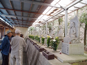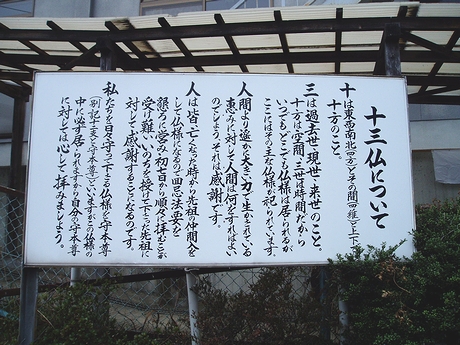 (右)十三仏とは不動明王、釈迦如来、文殊菩薩、普賢菩薩、地蔵菩薩、弥勒菩薩、薬師如来、観音菩薩、勢至菩薩、阿弥陀如来、大日如来、阿シュク如来、虚空蔵菩薩。