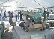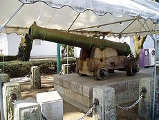 (右)建物を出て屋外出ると午砲がお出迎え 正午になるとこの大砲が なって時を知らせます 半ドンの語源にもなったそうです