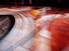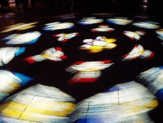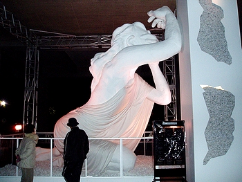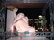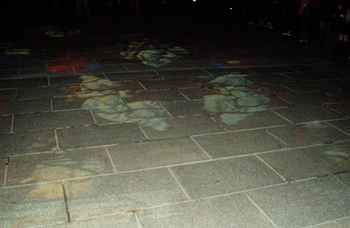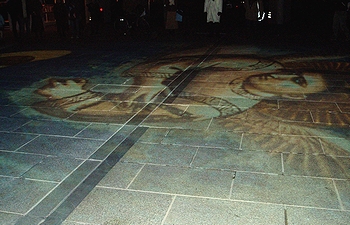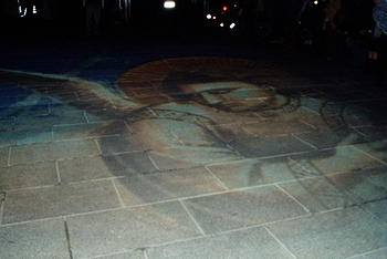 このライトアートイベントは、原爆記念資料館西館の南側で開催。子どもを戦争で失った女性のモニュメント(高さ5b)の前で、石井さんの音楽と映像を組み合わせた16分間の作品を石畳に投影した。