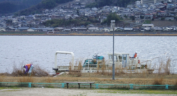 河口堰で堰き止められています芦田川ですから、小水呑橋〜芦田川大橋間には上流から流れ着きました様々なゴミが岸辺に付着しています。 で、これらのゴミをボートで除去作業となりますけど、定期的に行いましても絶えないゴミ類(^-^;
