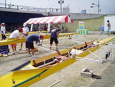 スタートには各レーン(漕路)ごとにスティクボートが固定されており、出漕クルーは、このスティクボートに艇尾をつけ、艇首をゴールに向け発艇線(スタートライン)に並びます。
