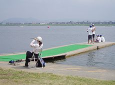 発艇時間になりますと、発艇員(スターター)は「スタート用意」の予令の後、各艇の準備完了を確認してから、「用意」次いで「ゴー」の号令と共に、赤い小旗を振り下ろして発艇させます。これがボートレースのスタートです。