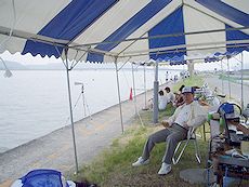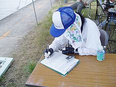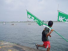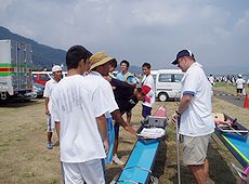 (左)人が走りますより、やはりボートの方が速いのですネ(^.-)☆ (右)記録係の担当の方も暑さで大変そぅでした(^.-)☆